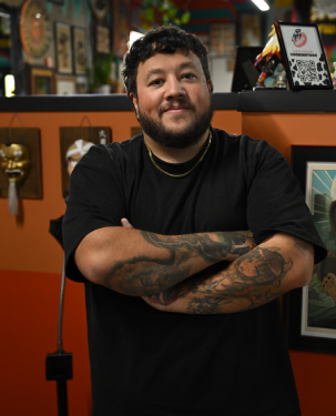 Kory is an incredible tattoo artist with over 15 years of experience in the DFW area, specializing in clean blackwork, fine-line detail,and precise stipple shading. Born and raised in Texas, he’s built a reputation for tattoos that are consistently crisp, bold, and perfectly executed. His experience shows in every piece he creates, whether it’s delicate linework or heavy, graphic blackwork. When he’s not tattooing, he’s spending time with his son, and he brings a steady, uplifting energy to the studio that clients and artists both appreciate.